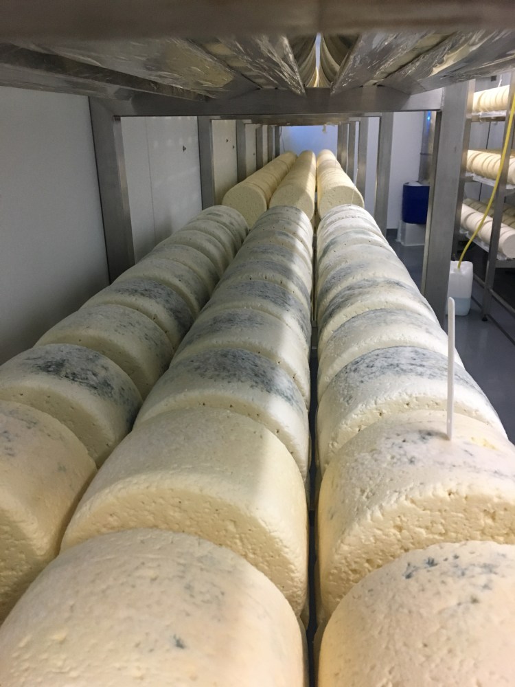 The cheeses are turned several times and stay in this room overnight, then they are moved to our Salting room.